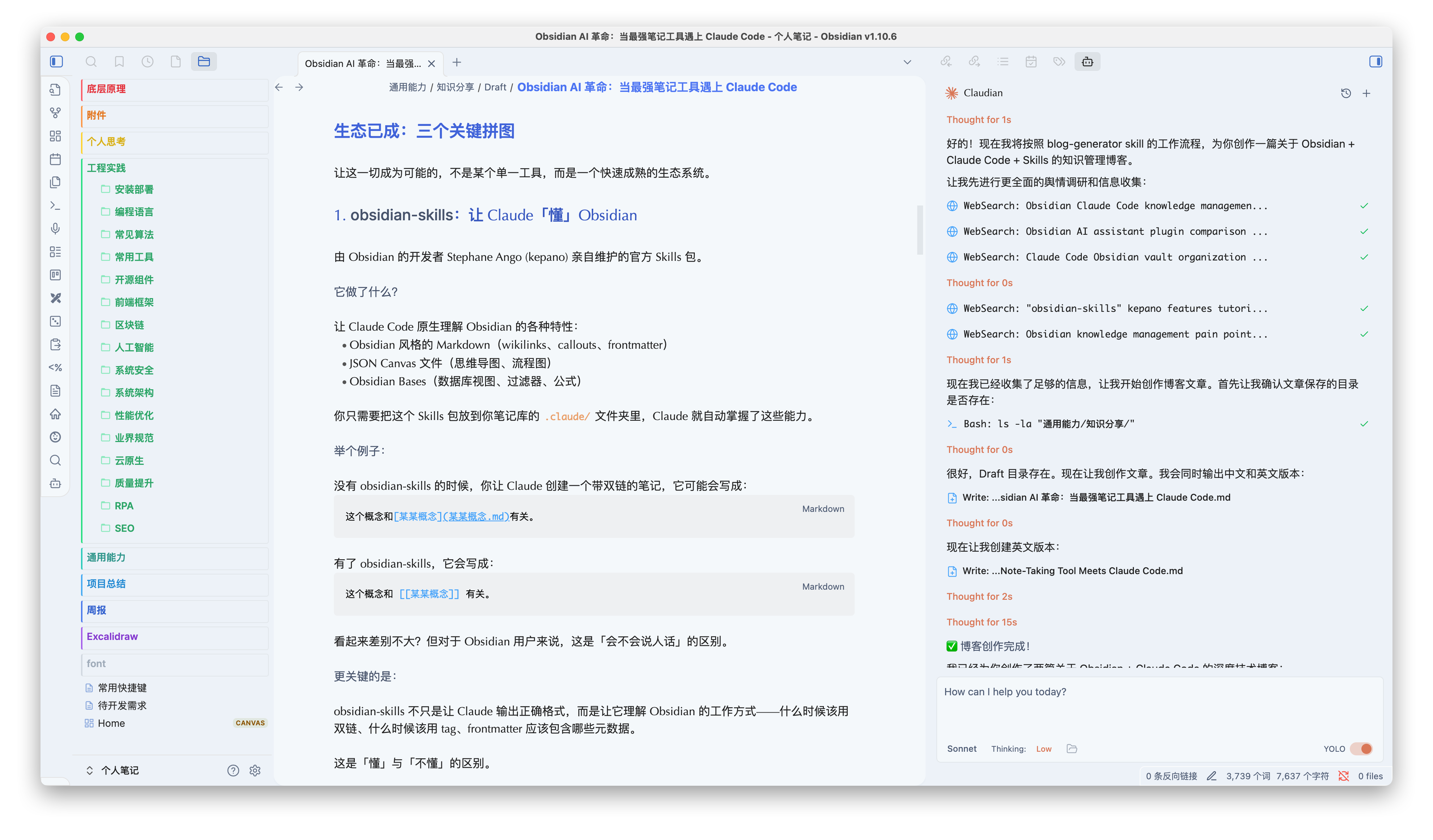 obsidian-skills doesn't just make Claude output the right format — it makes Claude understand how Obsidian works: when to use backlinks, when to use tags, what metadata frontmatter should contain.